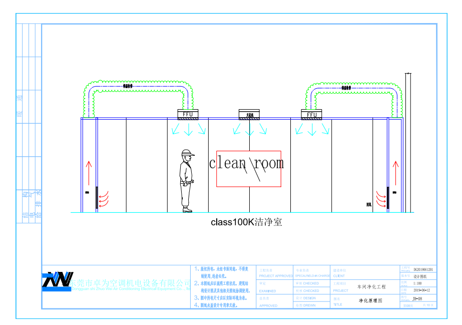 洁净度的实现是通过布置在车间上的FFU高效过滤送风单元过滤,足够的换气次数来实现的,新风采用初效过滤后送入车间。